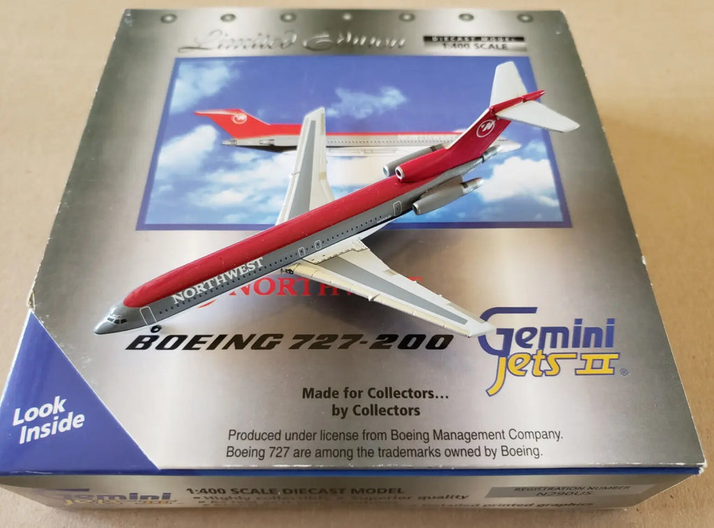 This is a new Northwest Airlines 727-200 in the "bowling shoe" Northwest Airlines livery made by Gemini Jets.