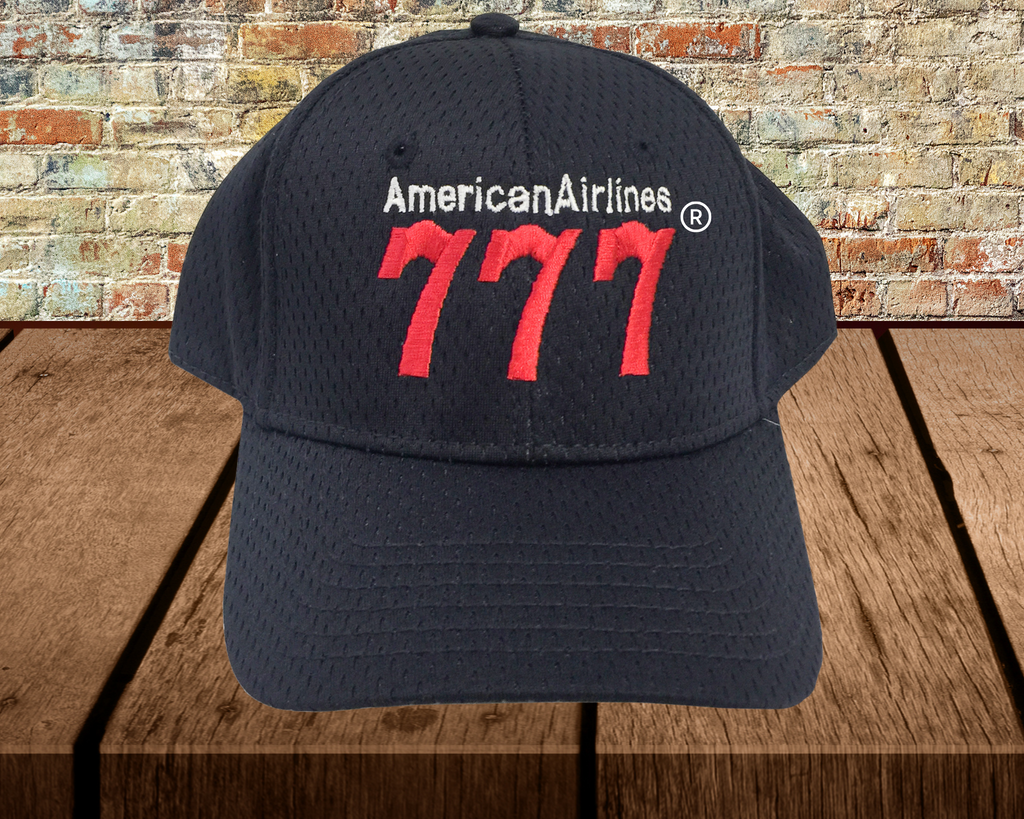 Navy mesh cap with embroidered 777 and logo. Adjustable