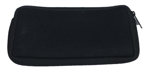 This travel pouch measures 4" x 8" x .125". It is made of black neoprene and is perfect to use on your next trip.