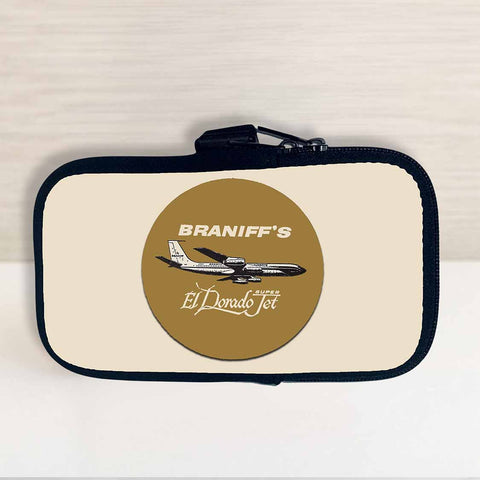 This water resistant travel pouch features the image of a vintage Braniff International Airways Golden El Dorado Jets bag sticker. The flip side is black.