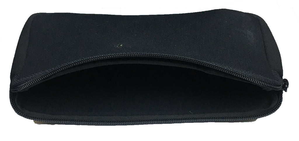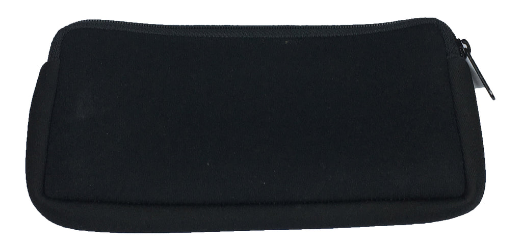 This travel pouch measures 4" x 8" x .125". It is made of black neoprene and is perfect to use on your next trip.