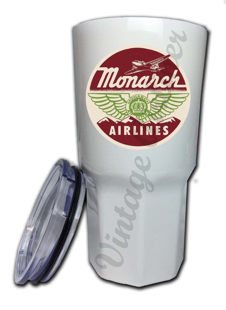 This white tumbler features a bag sticker from Monarch Airlines from the 1940’s.